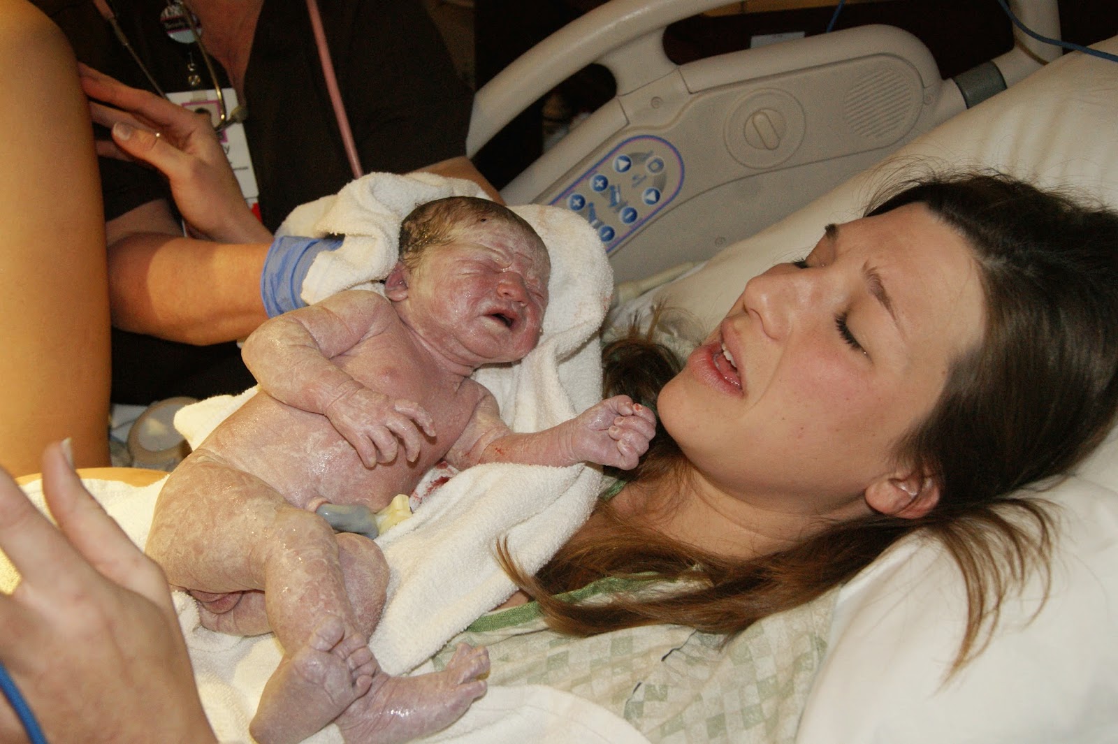 I quickly showered and packed a bag. I was headed to the gym and was smelly and looked like crap, so I did it quick! But after about 30 minutes at home, I could finally tell that I was in labor and it started to scare me. So we rushed to the hospital to go meet baby Paige. When I got there and signed in, all the nurses made fun of me that I was at a 6 and on the way to the gym. They thought I would have had her on the gym floor. I got all checked in around 10:30am, and Dr. Nabors came and broke my water at 11am. I got my epidural at 11:30am but it never really kicked in. My right thigh was completely numb, but not my left leg or my belly. They kept trying to give me more meds, but it never really worked. They eventually started my pitocin at 1:50pm because I was only at 7 cm and not really progressing quickly. I told them that the pitocin worked well and quickly with Harper, and that I only needed a little. Within 15 minutes, I was having serious pain with my contractions. They were huge and long and I was not able to breathe during them. After about 5 minutes of being in extreme pain, Cody called for the nurse. Sadly, the nurse call button didn't work and she didn't come for 15 minutes. I truly was in the worst pain. I couldn't move or breathe, I just wanted to push her out. The nurse finally got there and when she checked, she realized that Paige was right there and coming any second. She called Nabors, who got there in about 30 seconds, and we started pushing. Sadly, the epidural never really kicked in and I felt every single contraction and pain. My nurse, Leah, called it the "ring of fire" when you deliver a baby naturally. The name definitely suits. Thankfully, I only pushed two times and Paige was here. They asked Cody three times if he wanted to cut the cord and me once and both of us were a little overwhelmed and didn't want to. I was definitely exhausted and still in pain and couldn't take anyone talking to me or asking anything of me. I can't believe how bad Paige and I's first picture together is, but that face is exactly how I felt at the time. A little like death.